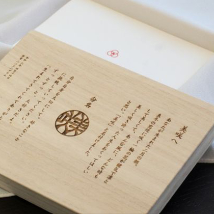 命名理由に加え、運気を込めた印影を中央に刻みます。通帳・印鑑などが入るサイズ。