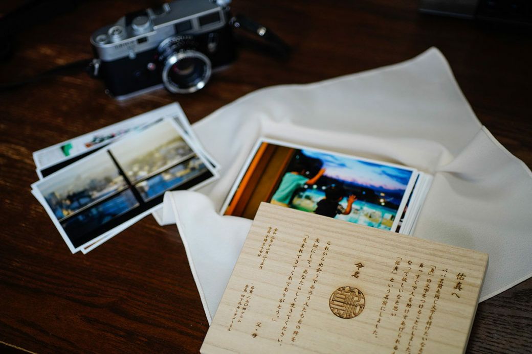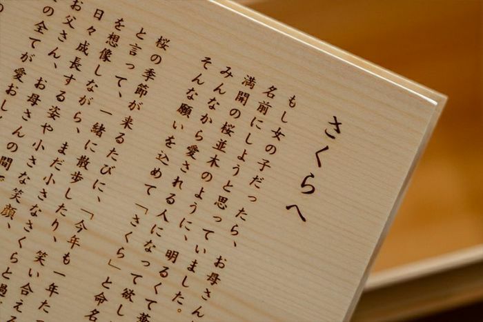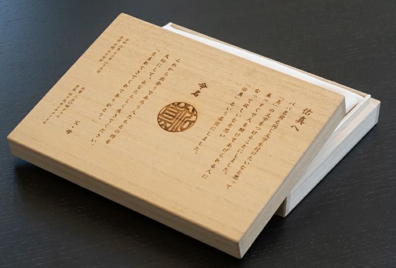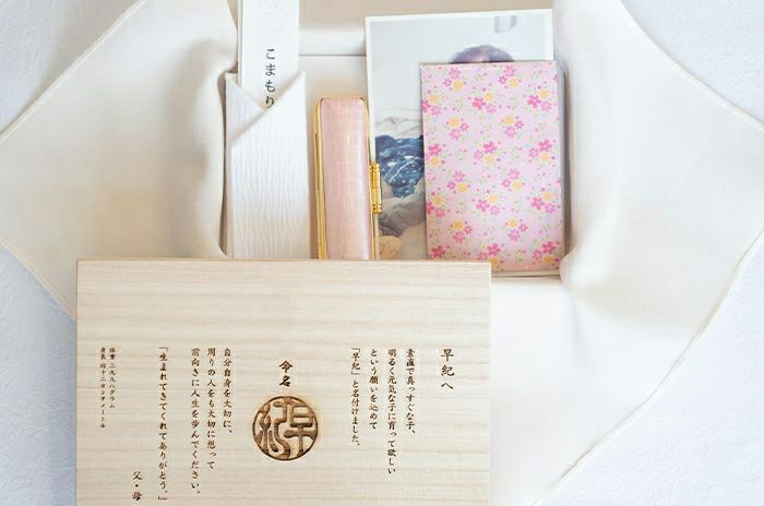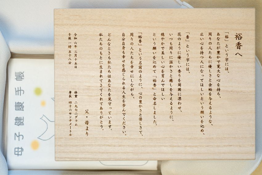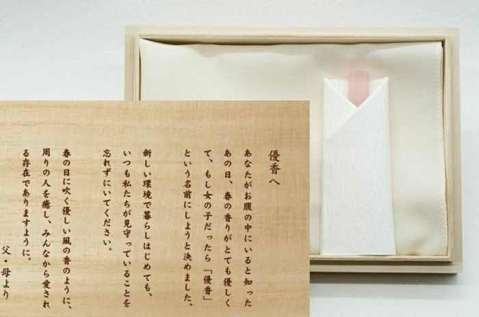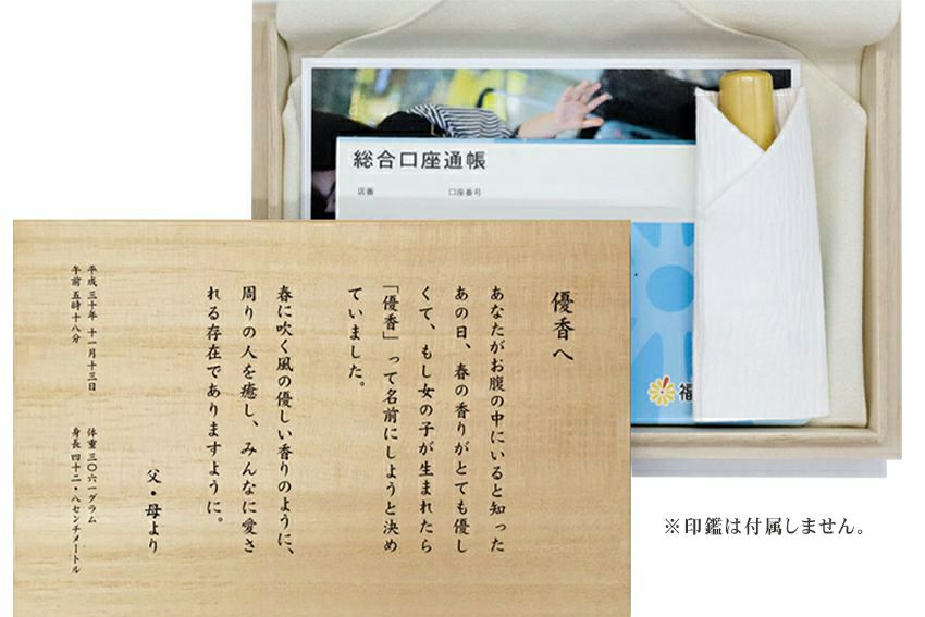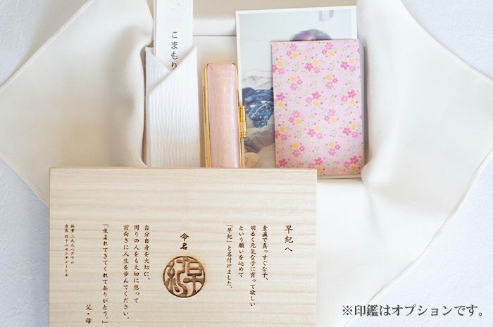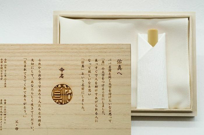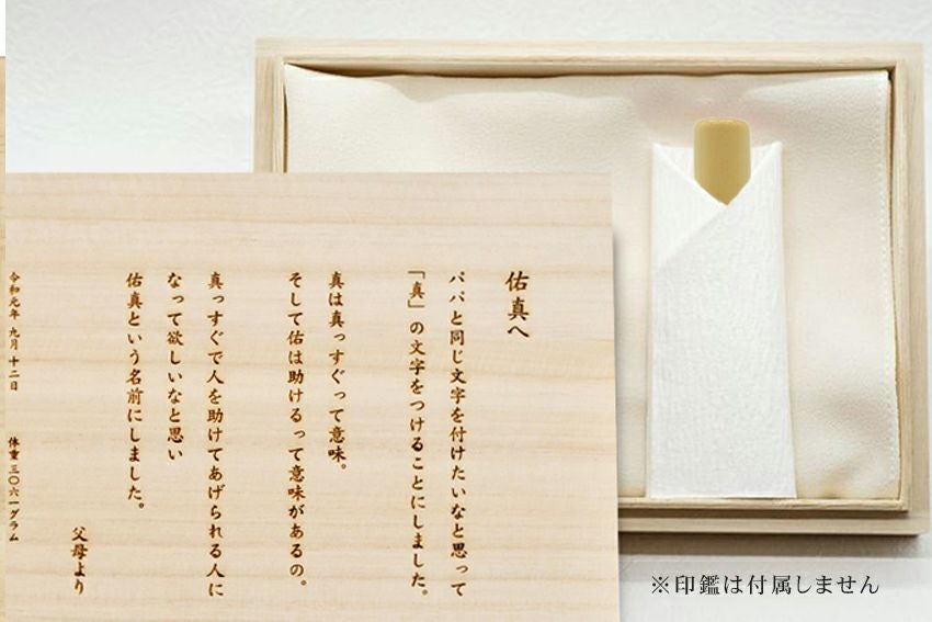 印鑑を、命名理由を刻んだ桐箱に添えて