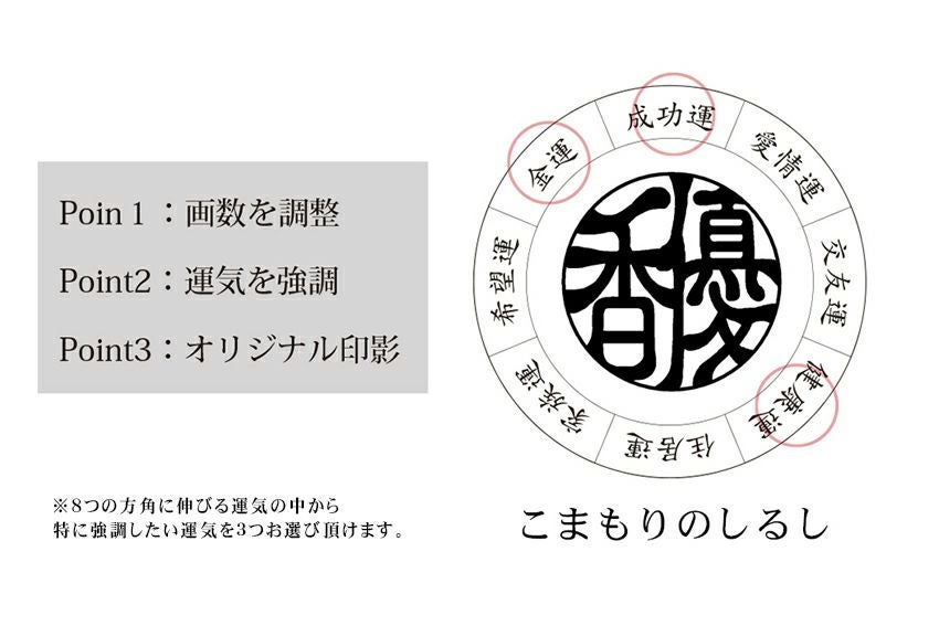 名前の画数を調整し、願いの運気を込めてつくる印鑑。