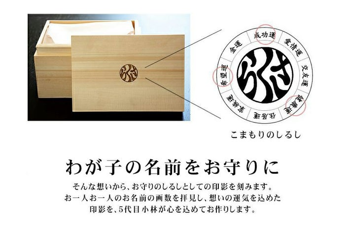 私たち小林大伸堂が約130年の歴史の中で培ってきた「開運印鑑」のスキルを活かし、わが子のお守り(こまもりのしるし)をお作りします。