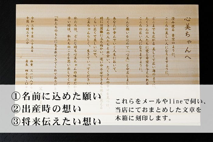 「命名由来」、「出産時に抱いた想い」や「将来伝えたい言葉」を刻んだこまもり箱は、時を超えて愛情を伝え続けることができます。