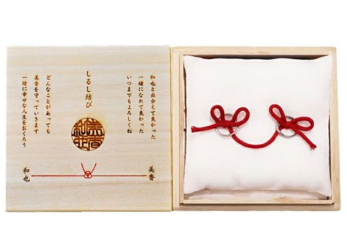 【しるし結び】リングピローは、永遠の愛を誓い合った二人の名前を結んだ印影と、誓いの言葉を刻むことで出来上がります。