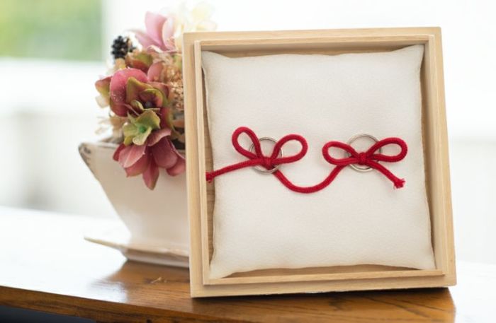 結婚指輪を結ぶ赤い糸は、「二人の愛がいつまでも結ばれ続けますように・・・」という切なる願いを込めて、1本の赤い糸で2つの指輪を結べる仕様になっています。