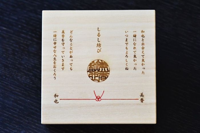 お二人の名前を結んで作るしるし結びの印影、メッセージ刻印が標準セットとなっております。ご注文後、印影にお入れするご希望の運気やお名前、お入れするメッセージ内容を伺います。
