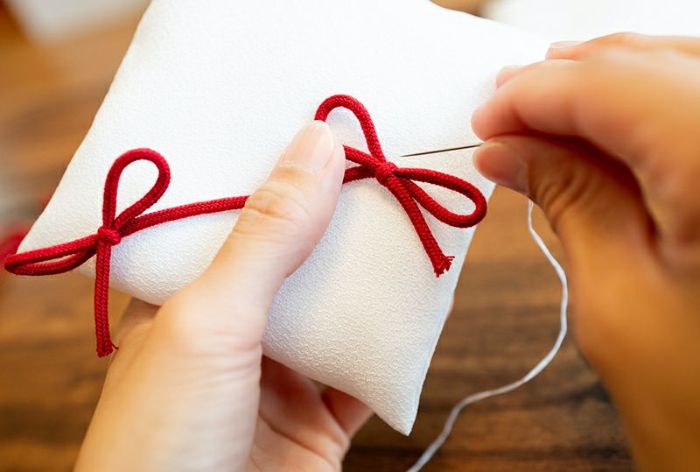 リングピローの土台となる布の縫製から紐の取り付けまで、手作業にてお作りします。