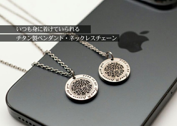 ふたりの名前を1つにした「しるし結び」の印を刻んだチタン製のペンダントは、不確かな時代に永遠を誓うふたりの心を、固く結び続けます。